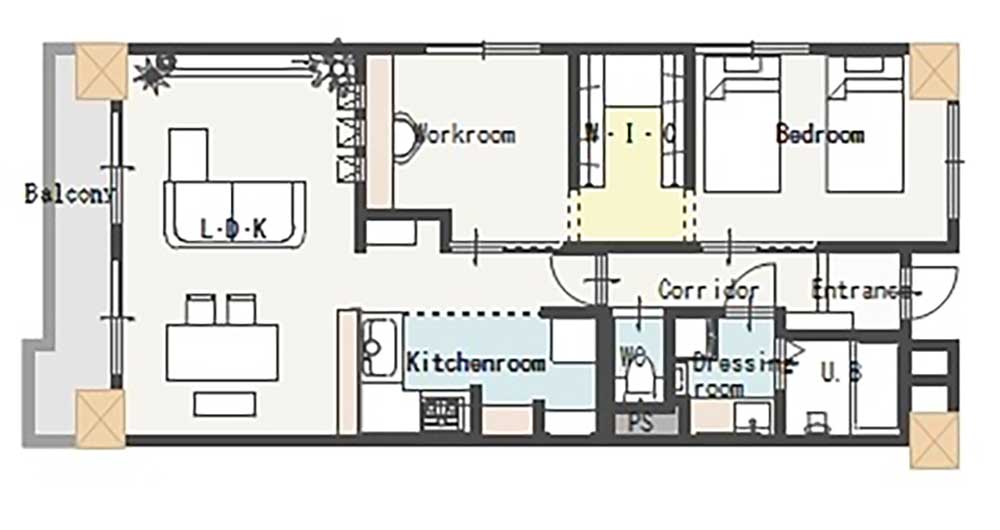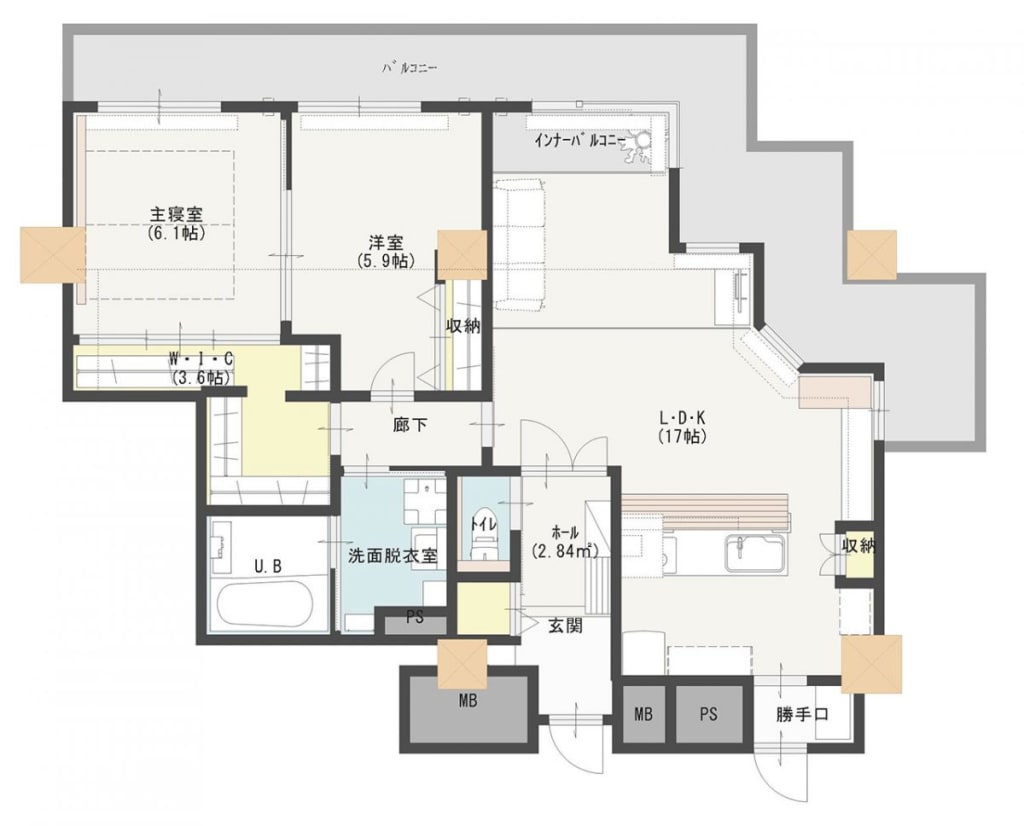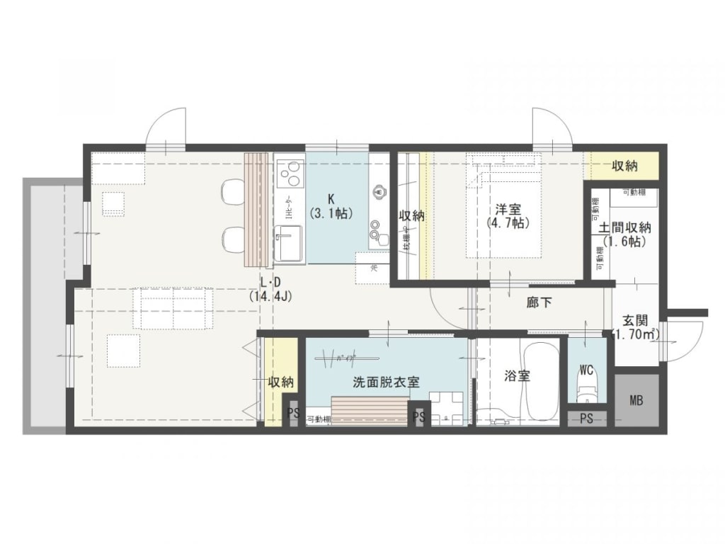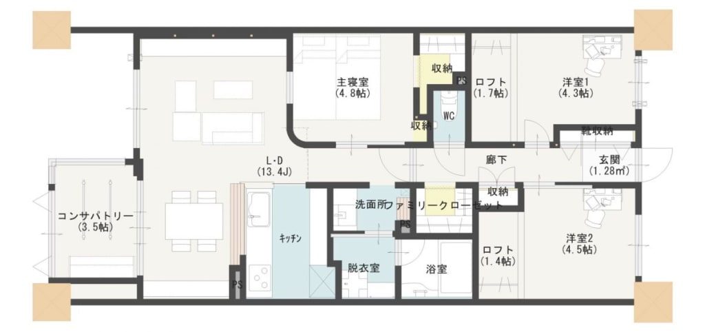 開閉できる室内窓のある個室のワークスペースや、キッチン隣接の大容量収納など、機能性も考えられています。