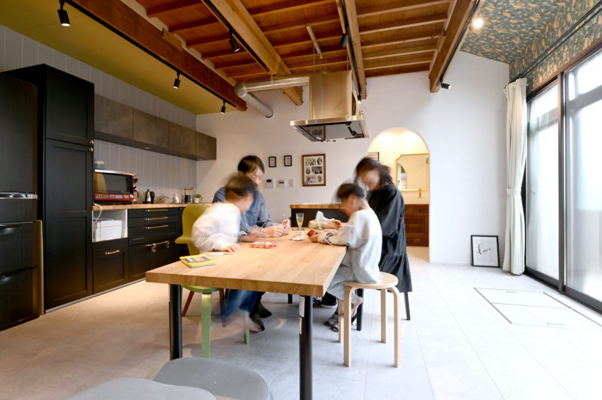 現しの天井、自分たちで漆喰を塗った壁、子供たちが遊ぶロフト、希望通りのキッチン、大事な家具をリメイク、などなどこだわりたい部分を明確にして、ひとつひとつ実現していったリノベーションです。