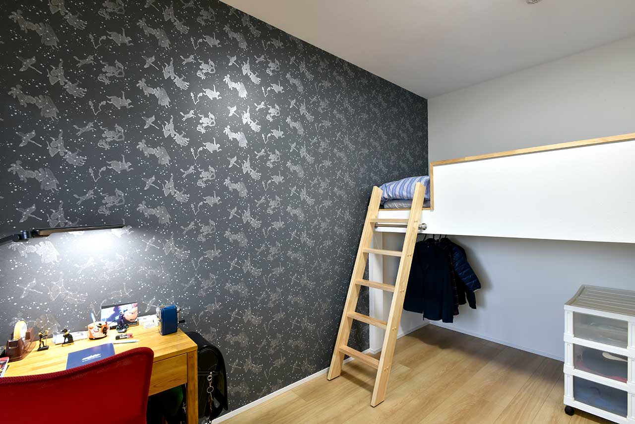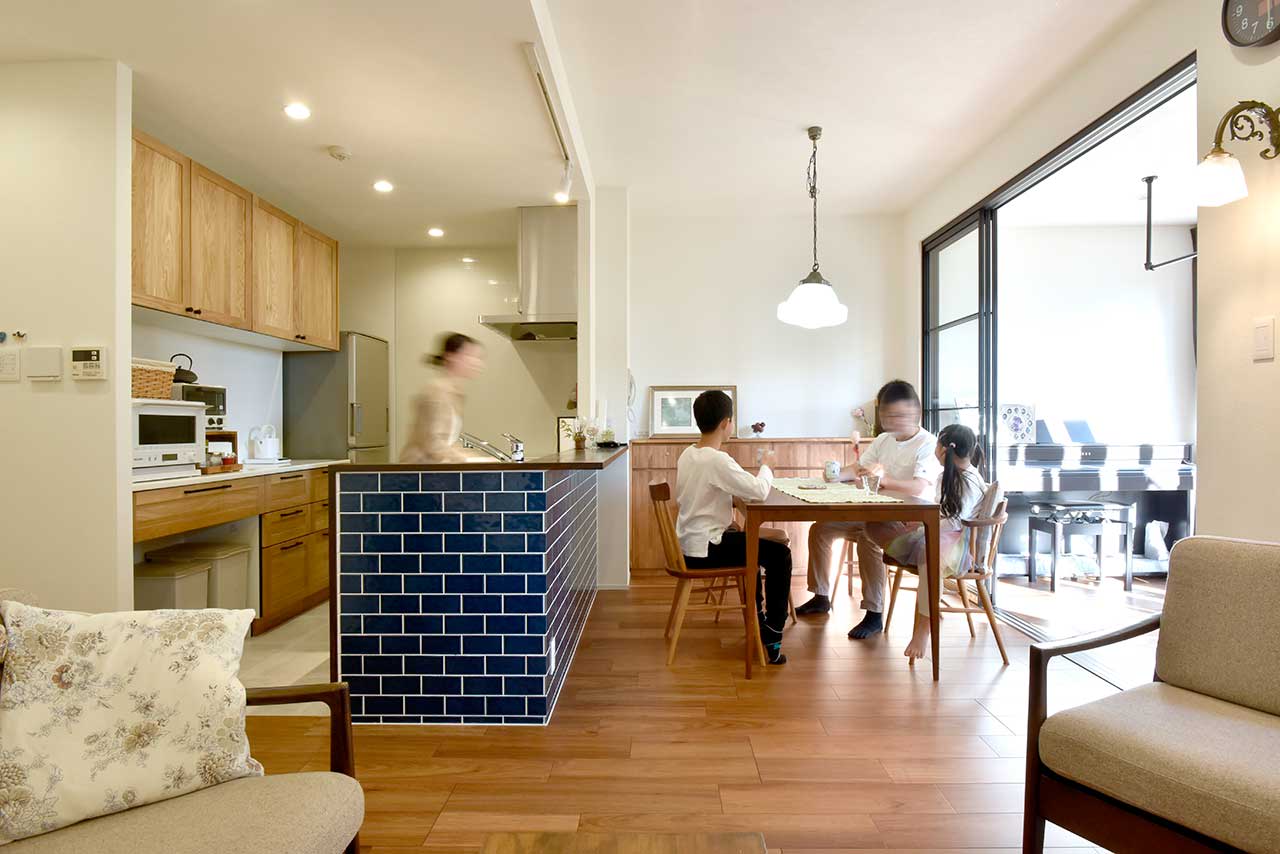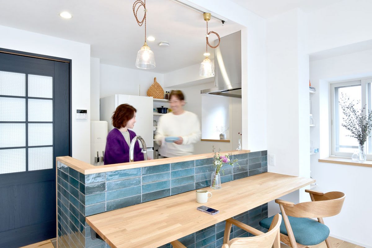 成長したお子様のためにロフト付きの個室を設ける間取りに変更したリノベーション。キッチンは、フローリングやキッチンのナチュラルさと壁や天井の清潔感あるホワイトに合わせた、深みのあるblueが映えます。