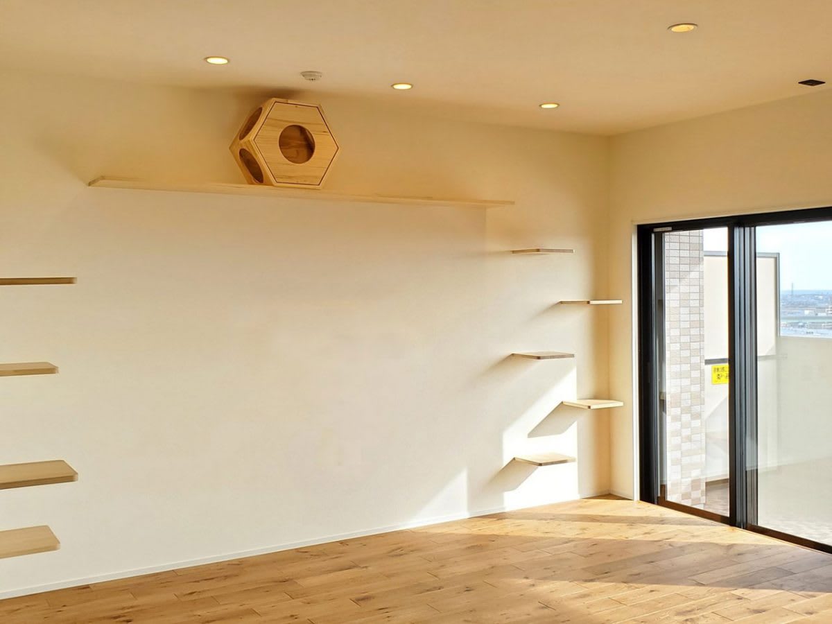 「ネコちゃんの為のお家で、おしゃれに暮らしたい!」がコンセプトのお家。リビングのキャットウォークや壁のくぐり穴などネコちゃんの動線も考え合わせた間取りをプランニングしました。