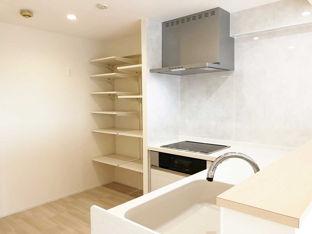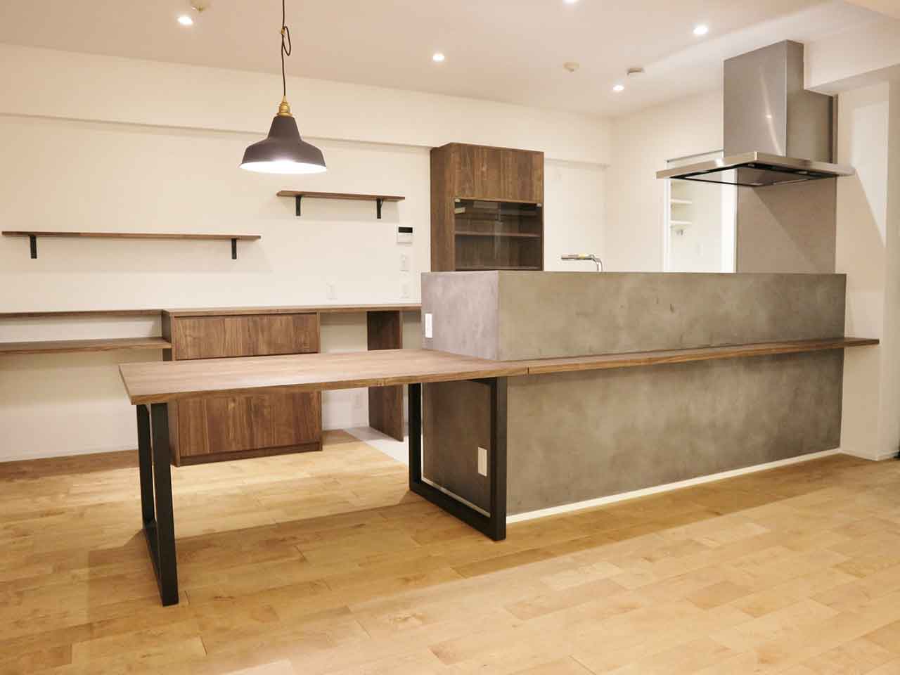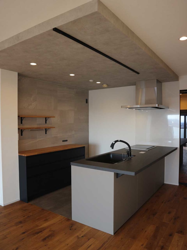 キッチン腰壁にはモールテックスを採用し、洗練されたクールな素材感と温かみ髪を感じさせるコテの跡が落ち着いた大人の空間を演出しています。