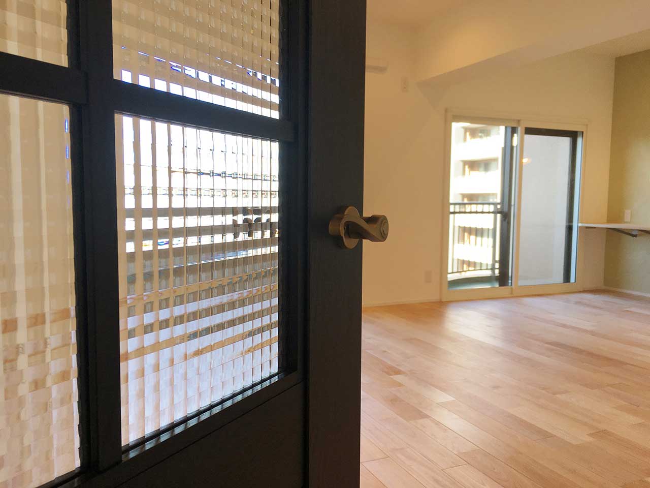 窓から外が見える向きのキッチンはお料理をしながら景色が楽しめます。キッチン横のガラスドアの先は玄関。リビングの自然光がガラス越しに届き、明るく開放的な玄関に生まれ変わりました。