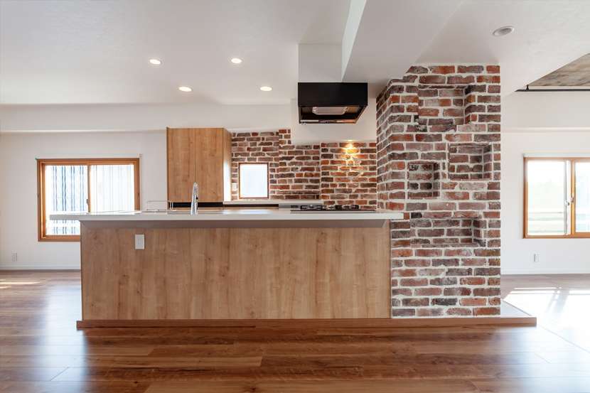造作したウッド調のカップボードにサブウェイタイルを合わせたブルックリンスタイルのキッチンが目を引きます。内装はホワイトをベースに、キッチンの天井はダウンライトですっきりと仕上げています。ブラケットタイプの時計やインダストリアルなデザインのペンダントライトを取り付けておしゃれな雰囲気に。