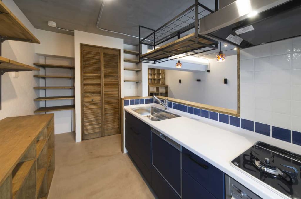 中に入ると、キッチンと色を合わせたネイビーのタイルが印象的です。シンクの上部・背部などあらゆるところに収納が確保されており、家族全員分の食器や食材ストックをしまっておくにも十分な収納力。正面に見える扉の中には、なんと洗濯機が格納されています。意外な組み合わせですが、料理と洗濯を並行して進められる動線は効率的なのです。