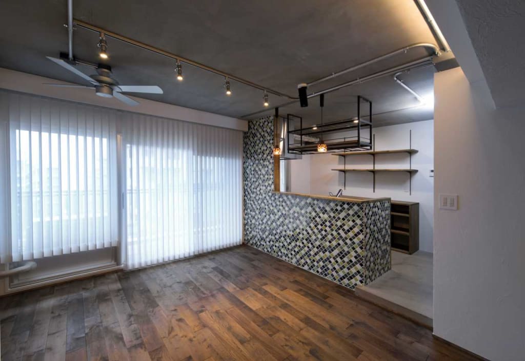 最初にご紹介するキッチンは、カウンターにあしらわれた鮮やかなブルーとグリーンのモザイクタイルがアクセント。シンプルなLDKに程よい個性をプラスしています。