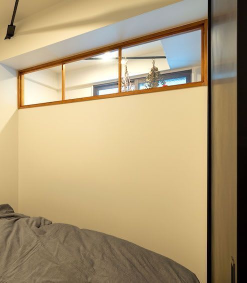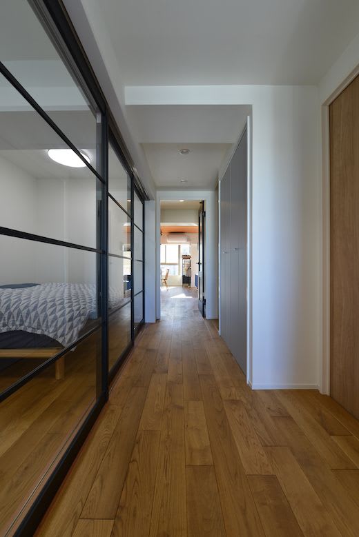 寝室と廊下を仕切る扉を大胆にもガラス扉にし、床の無垢フローリングを廊下から奥のリビングまで縦一線に張っています。玄関からリビングまで開けた視界により、空間を広く見せられるテクニックです。