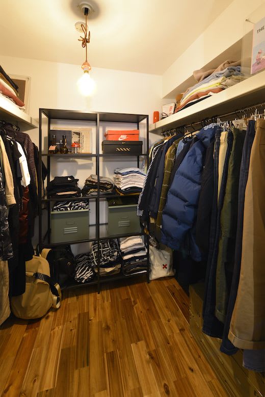 2LDKから1LDKに部屋を減らしたことで、使い勝手のいいウォークインクローゼットを設けることができました。元は部屋ごとに分かれていた収納を1箇所にまとめられるため、居室空間を最大限有効活用できるのもポイントです。