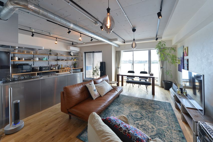 続いての1000万円台フルリフォーム事例は、カフェテイストをテーマに仕上げた部屋。カフェテイストと一口に言っても、どんなカフェを目指すかによってイメージはさまざまです。そこでポイントになるのが「何の素材を使うか」ということ。カフェテイストという大枠のテーマに加え、木×アイアンという基本素材を決めることにより、全体に統一感のある内装に仕上がっています。天井のウッドパネルやオールステンレスのアイランドキッチンなど、部分的に存在感のある素材を取り入れることで空間にメリハリが生まれていますね。