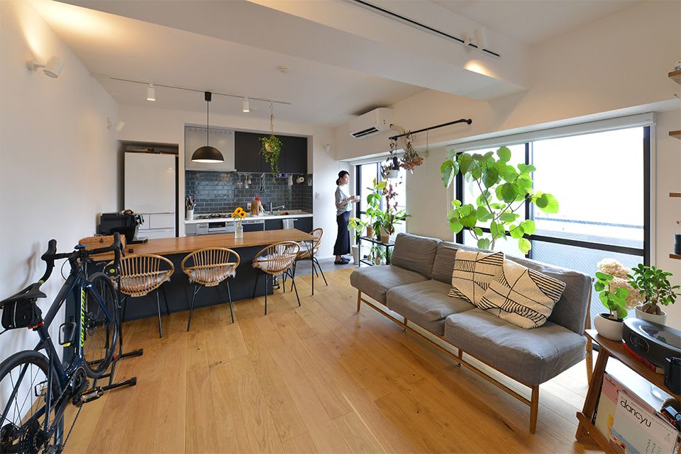 1つ目の事例は、55m2・2LDKの部屋を1LDKとすることで、ゆとりある間取りを実現した一人暮らしの部屋です。画像は明るく開放的なリビングの様子。窓際の床はキッチンと同じ防水性の塩ビタイルで作られており、植物をたくさん置けるインナーバルコニーとなっています。これだけ広さがあれば、リビングダイニングにも遊びを持たせられますね。
