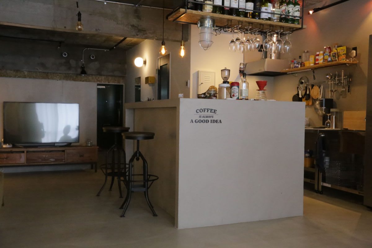 こちらはキッチンではありませんがなく、LDKの天井や梁をモルタル風仕上げにしています。モルタル風にすることで、躯体を見せるスケルトン天井のような見た目になり、インダストリアルテイストなLDKになっています。