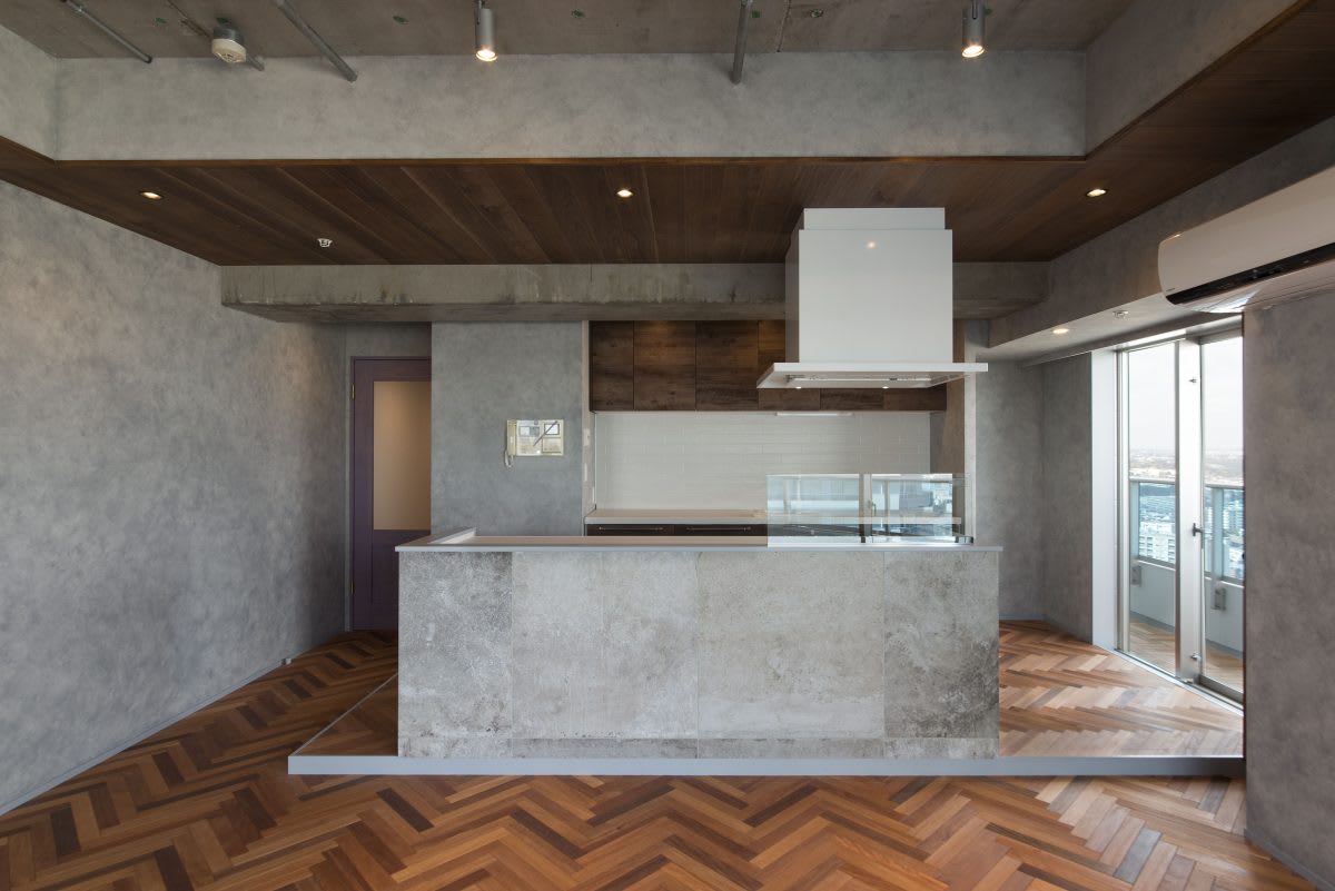 アイランドキッチンをモルタル風仕上げにすることで、統一感のあるモダンな空間になっています。無機質ながらも木との張り分けによって温もりがプラスされ、重厚感と存在感を兼ね備えたキッチンに仕上がっています。
