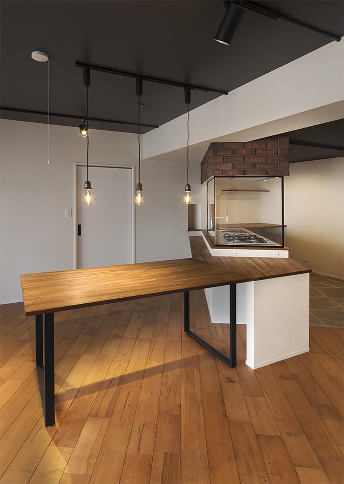 同じくこの空間では「黒」がひとつのポイントになっています。テーブルに使っている足、キッチンのガラスの枠、照明のコード、天井を揃えることで統一感のある雰囲気が出ています。ここまでこだわり雰囲気を揃えておくと後から入る椅子やインテリア小物もまとまりやすくなります。動かせない部分の色や素材の統一は大事なポイントの一つになります。