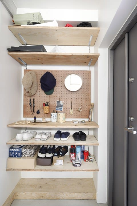 外への持ち出しやすさや帰宅後の動線の良さからキャンプ道具の収納場所として最も採用されているのが玄関、シューズクローゼットです。靴のまま作業ができ、汚れにも強いという点が魅力。