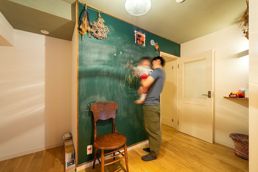 こちらの事例は、壁一面を黒板として使っています。思い立った時にすぐ描ける環境があると、自己表現の幅も拡がりそうですね。