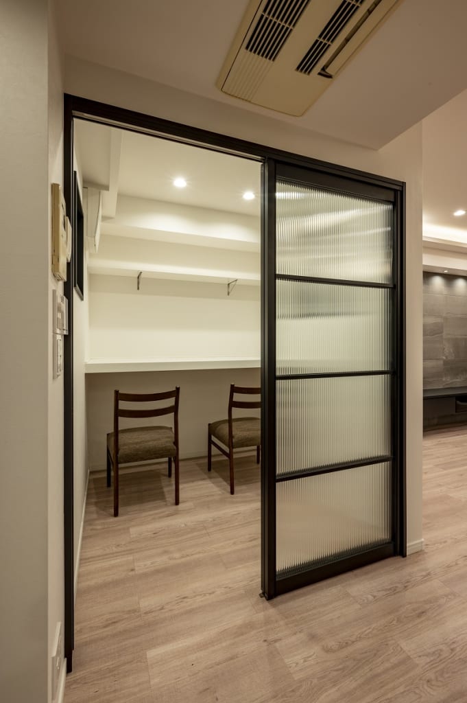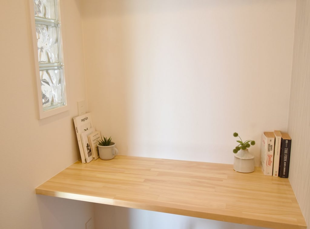 1つ目の事例は、LDKに隣接したところに設けられたプチ書斎。デッドスペースになりがちな小さな空間を有効活用することで、生活空間を邪魔せずに集中できるワークスペースを実現しています。壁に設けられたガラスブロックからLDKの光が差し込み、仕事や作業に集中していても常に家族の存在を感じられるのがポイントです。