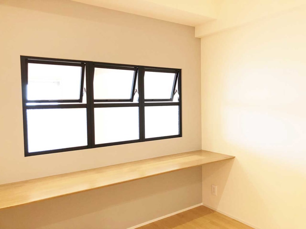 上部のみ開放できる室内窓を採用しているので、プライベートを確保しながら換気もできる嬉しい仕様です。室内窓があると家族とのコミュニケーションが取りやすいのもメリットと言えるでしょう。壁には大きなカウンターが備え付けられていて、パソコンや周辺機器、書類などを大量に置いても余裕のあるスペースになっています。