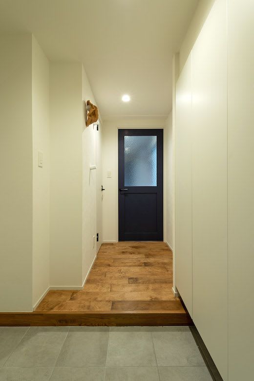 この事例では、白い壁とグレーのタイルで整然とした玄関を作りました。ベーシックな色味を使うことで、ネイビーのドアや無垢フローリングの質感が際立ちます。土間を広めに取ったゆとりある玄関が、よりスッキリとおしゃれに仕上がりました。