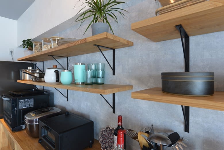 ブラケットと棚板を使って見せる収納棚を造作しています。こちらのアイアンブラケットは無駄な部分をそぎ落としたシンプルなデザイン。どんな空間にも映えます。棚に食器類をぎっしりと詰めるのではなく、余白を持たせて並べることですっきりとした印象を与えますね。収納というよりもディスプレイの要素が強く、「見せる」ことを意識した収納スペースにしています。