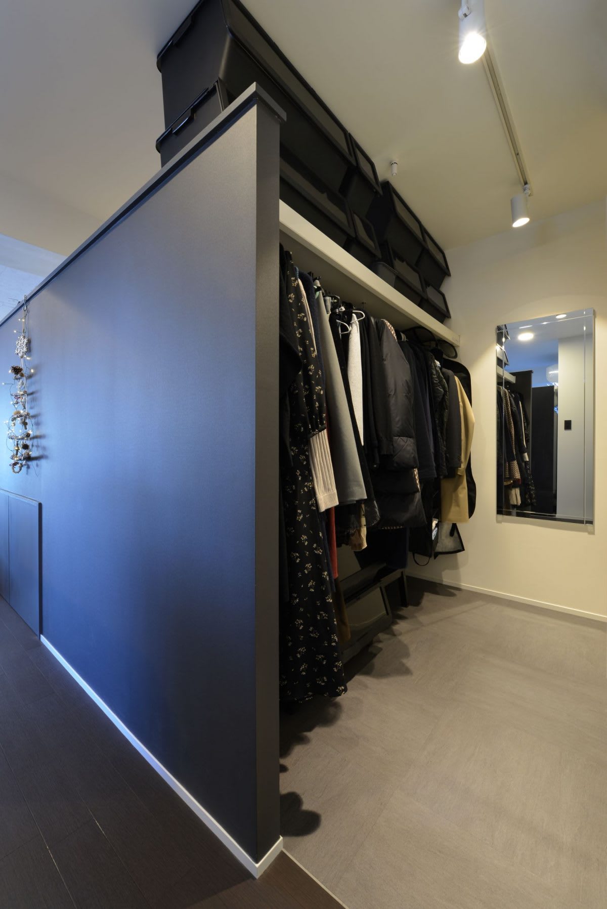 家づくりにおいて重要な収納は、リノベーションにおいてもこだわりたい一つ。こちらは広さを確保しつつも小物を駆使して使い勝手のいいWICにした事例です。動線の幅を広げて姿見を取り付けたことで身なりを整えられます。選びやすいようにハンガーレールを付け、照明は明るく照らすスポットライトにしたことで、ショップのフィッティングルームのようなWICに仕上げました。