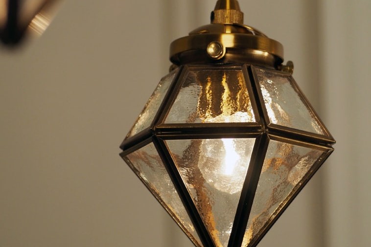穏やかな明かりが灯る、宝石のような輝きが魅力のペンダントライト。小さなガラスを囲むゴールドのフレームに細やかな手仕事が見て取れます。レトロなソケットデザインや大胆に広がる影模様など、夜空に瞬く星屑を飾るようにお楽しみください。