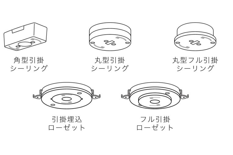 上記の天井配線器具(引掛けシーリング)への取り付けが可能です。