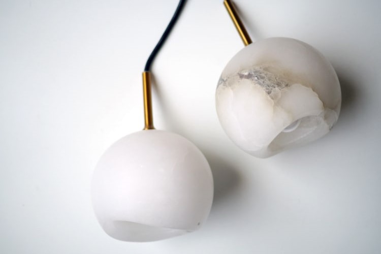 透き通るような白さを持つ鉱物、アラバスターを削り出して作ったペンダントライト。滑らかに研磨された外側とは対照的に、内側は堀削の跡をあえて残しています。裾には流れるようなウェーブを施すことで、モダンかつプリミティブな表情が堪能いただけます。自然が作る唯一無二のマーブル模様を浮かべながら、月のように朧げな光を放ちます。