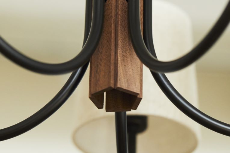 ウッド支柱にアイアン、ファブリックシェードとの相性がとても良い、シャンデリア風ペンダントライト。点灯していない時は、お部屋のインテリアとしても存在感を発揮します。