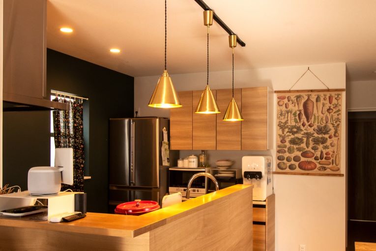 こだわりの真鍮製のペンダントライト。シンプルなデザインのもので、真鍮特有の輝きと高級感があります。モダンでスタイリッシュな印象を与えるこのシーリングライトはおしゃれなインテリアのアクセントとしておすすめ。キッチンやダイニングテーブル、カウンターなどにどうぞ。