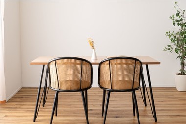 ラタン調×ファブリックのスタイリッシュなデザイン。ポリエチレン素材のラタン調デザインを施した背面と、ファブリック素材の座面の組み合わせが新鮮なチェア。