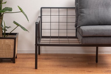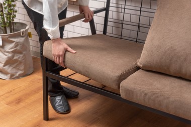 弾力のある背面クッションと、程よい硬さで座りやすい座面クッションのリラックスできるソファ。アームカバーは取り外し可能。