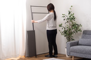コンパクトで軽く、どこにでも持ち運べる大容量のフォールディングハンガー。ショップのディスプレイのようにお気に入りの洋服や小物を飾って収納ができます。前後で高さが異なるので、掛けやすく取り出しやすいデザイン。脚の先端には保護パーツが付いているので、床への傷防止にもなり安心。