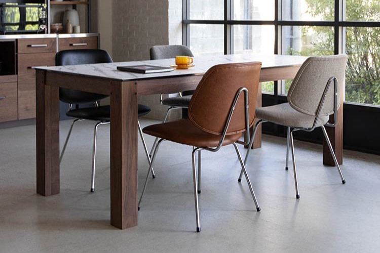 ミッドセンチュリーデザインをベースにしたチェア。当時をイメージしたレトロさとモダンな雰囲気を取り入れました。エッジの効いた脚と木製の肘置き、背のパイピングなど細部のディティールもこだわっています。背と座のシートが優しくしっかりとホールドしてくれる座り心地です。