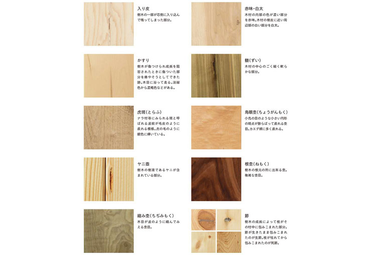 上記に挙げる「木の特徴」があります。これは製材過程や木の成長過程で生じるもので、いわば「天然木だからこそ」の「表情の一部です」。