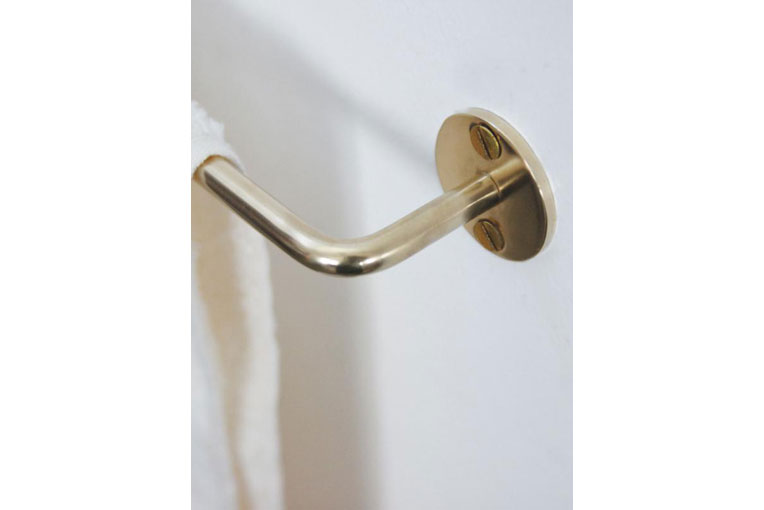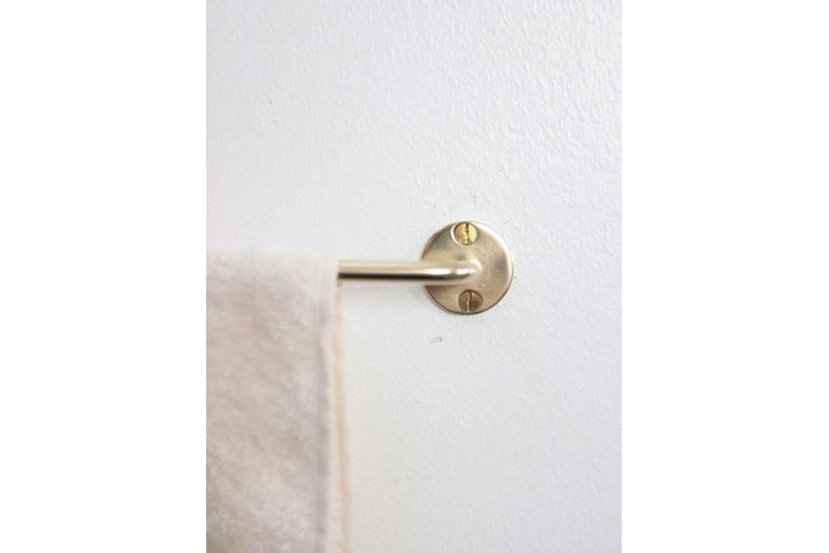 シンプルなブラスタオルバー。すっきりとしたコンパクトなデザインなので、キッチンやトイレなど狭い場所でも圧迫感なく設置ができます。