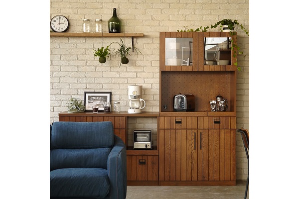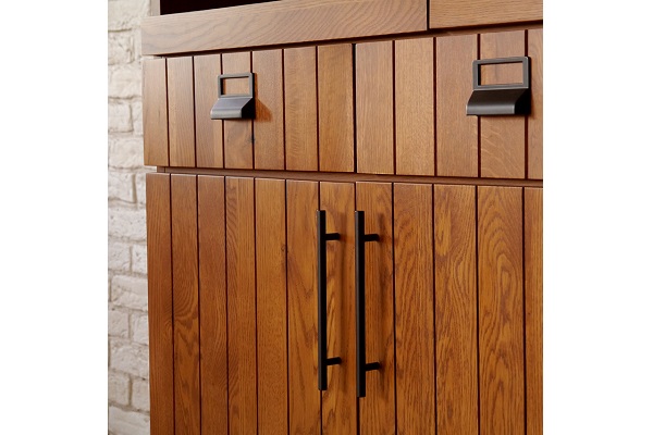 スリット入りのオーク材の素材感が前面に押し出されたキッチンキャビネットです。