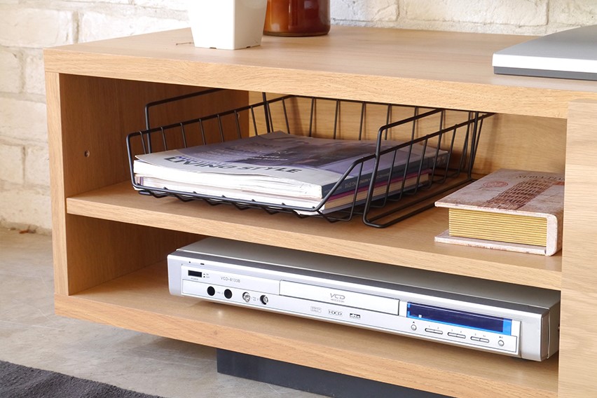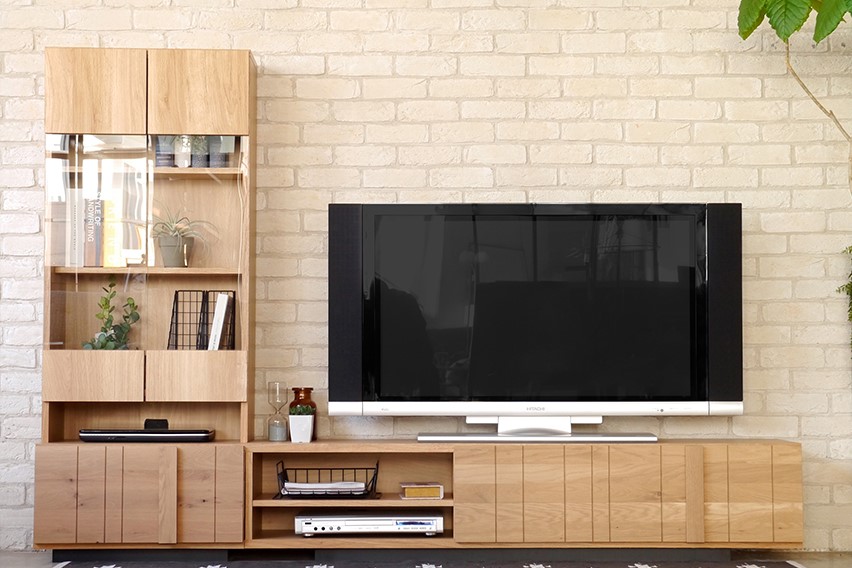 スリット入りのオーク無垢材がアクセントとなった北欧テイストのTVボードです。