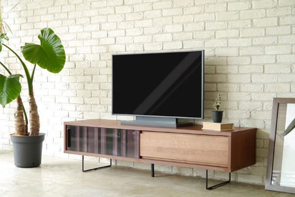 ストライプの入ったスライド式ガラス扉が印象的な、スタイリッシュでかっこいいテレビボード!