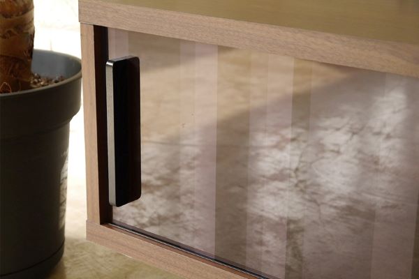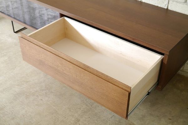 前板にオーク無垢材を使用したテレビボードです。ストライプ柄のガラス扉が特徴的です。引き出しにはスライドレールを使用しています。