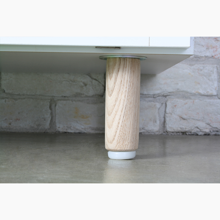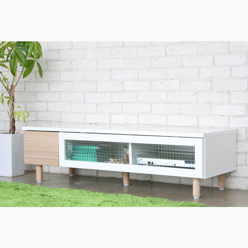 無機質になりがちな白一色に、ポイントとしてタモ無垢材を使いました。 ガラス扉はプッシュ式。天面にはコード通し穴があるので、配線もラクラク。