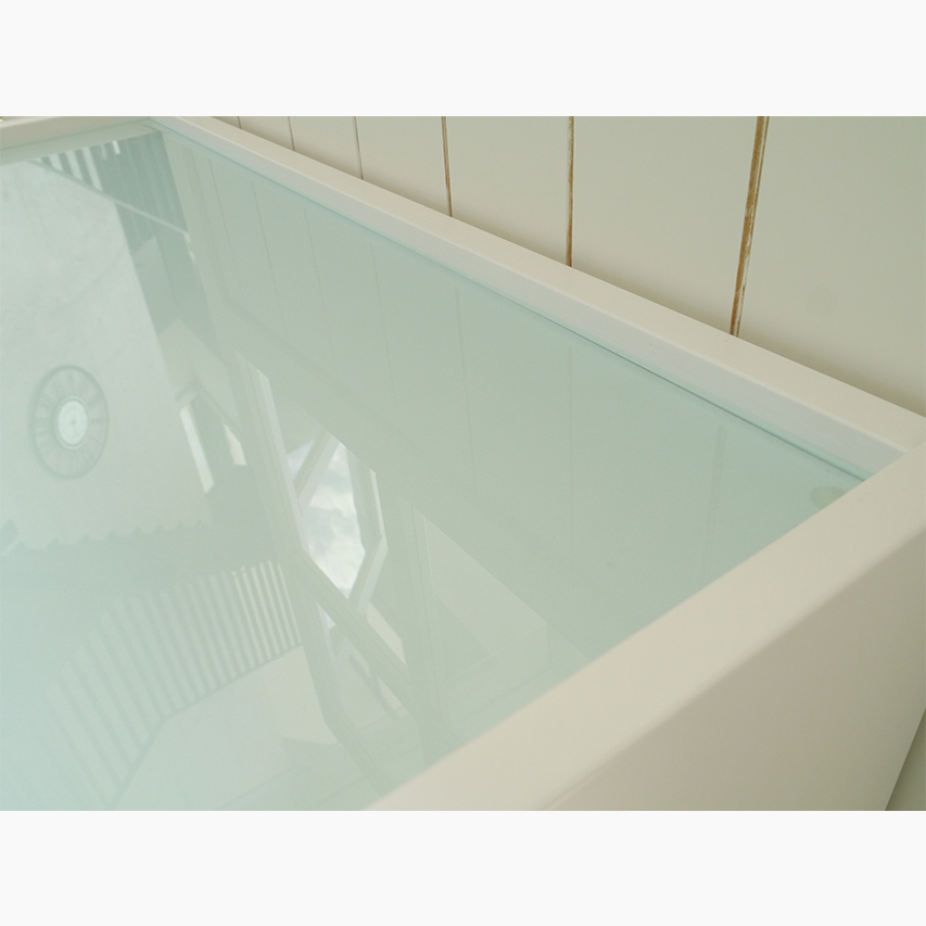 天板には8mmの強化ガラスを使用しています。しっかりとした厚さですが、光を反射するので空間を広く感じられます。