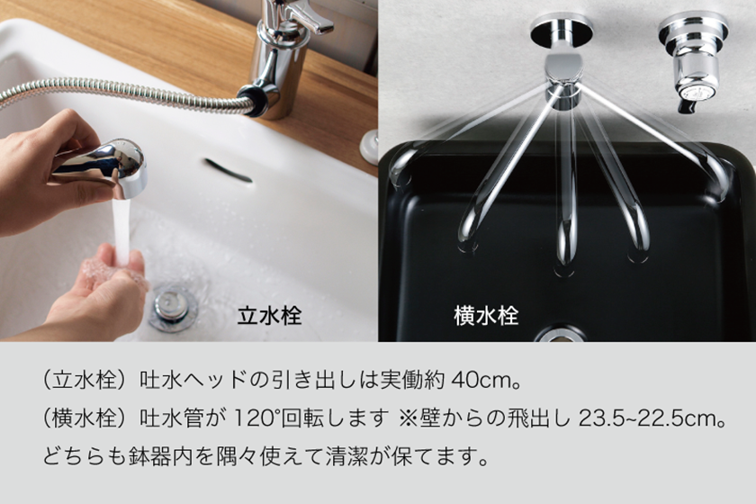 オーバーカウンター型、置型両方の洗面器に合わせる事ができ、設置のスタイルを選びません。