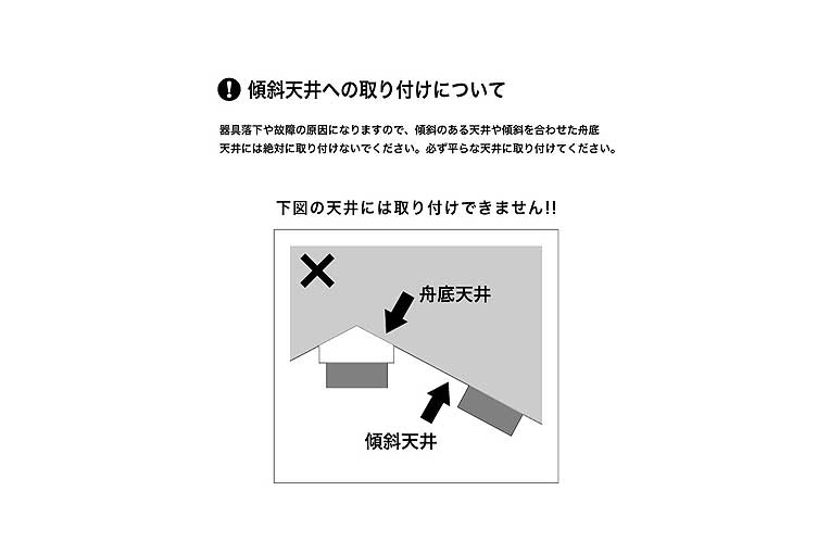器具落下や故障の原因になりますので、傾斜のある天井や傾斜を合わせた舟底天井には絶対に取り付けないでください。必ず平らな天井に取り付けてください。