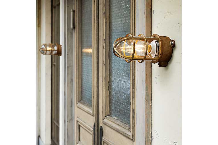 船舶用照明に採用されている耐久性の高いパーツをそのまま製品化したポーチライト。屋外環境にも耐える真鍮の堅牢さとレトロな雰囲気が機能美と存在感を放ちます。