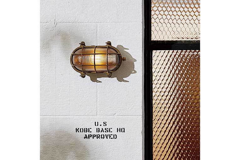 船舶用照明に採用されている耐久性の高いパーツをそのまま製品化したポーチライト。屋外環境にも耐える真鍮の堅牢さとレトロな雰囲気が機能美と存在感を放ちます。