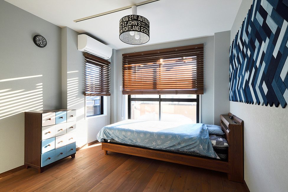 デニムブルーのコンセントがカジュアルでおしゃれな空間を演出します。