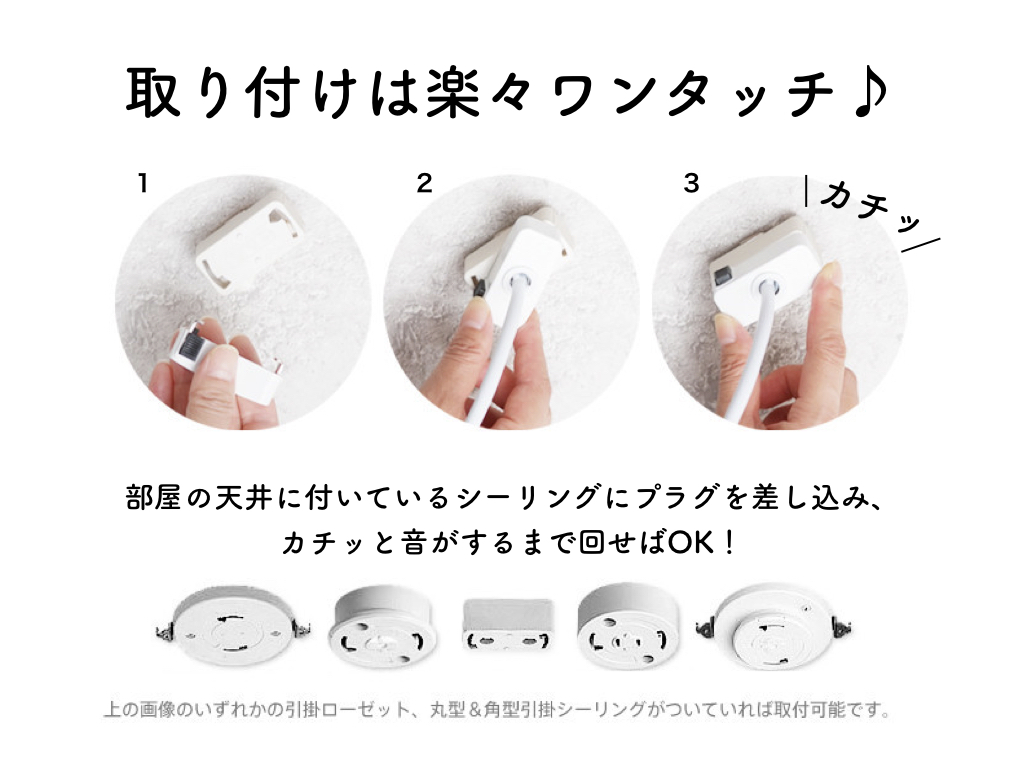 ご自宅の天井からシーリングを見つけたら、カチッと言うまで差し込むだけ!組立も不要なので、簡単に設置できます。