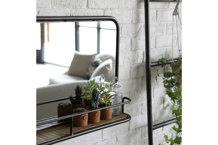 さりげないパイン古材の収納スペースもうれしいポイント。グリーンやボトルを置いて、身繕いに加え、おしゃれなインテリアとしてもお使いいただけます。