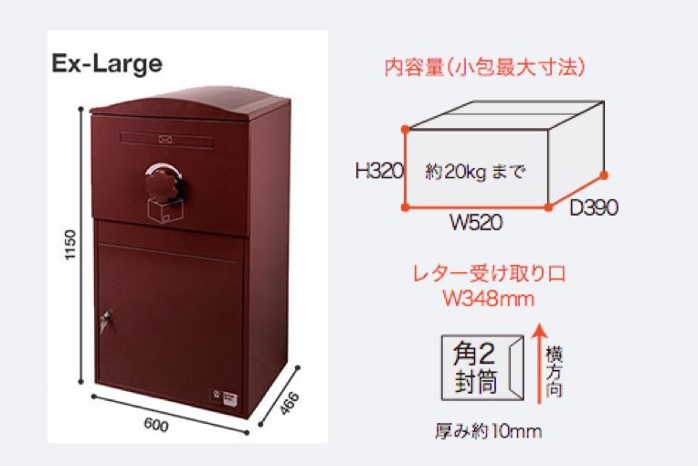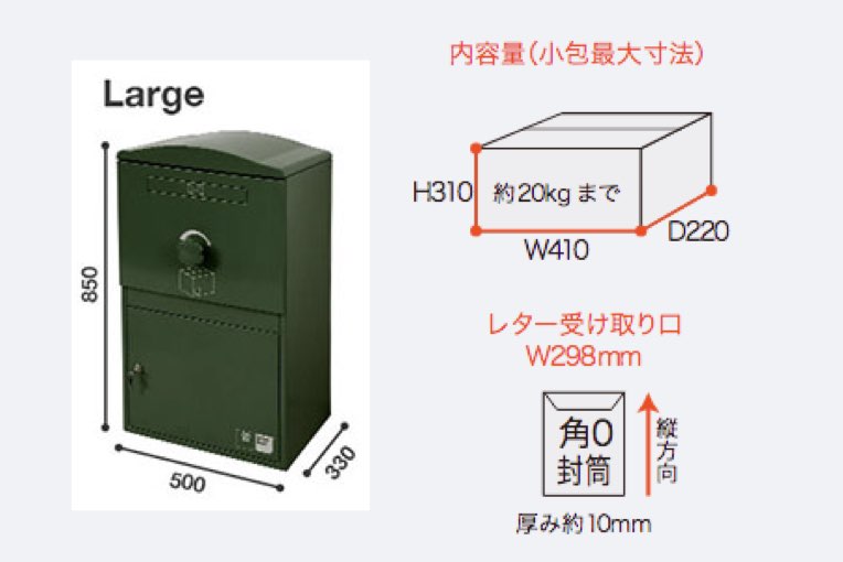 ・内容量(小包最大寸法):W320×D220×H180mm(約20kgまで対応)・レター受け取り口:W250mm(角2封筒対応)、厚み約10mm※厚み約10mmのA4サイズが縦方向に入ります