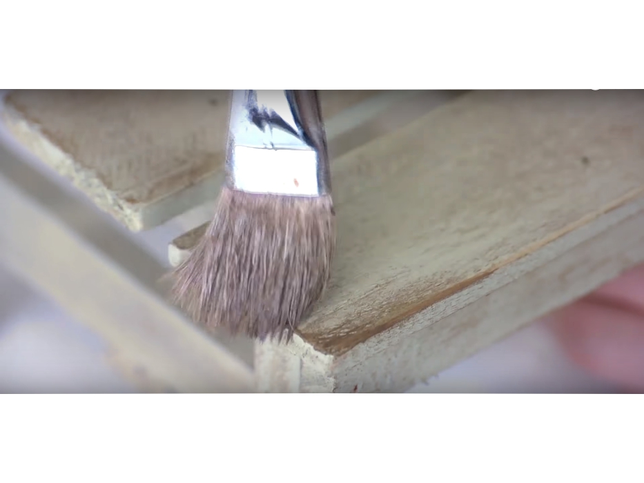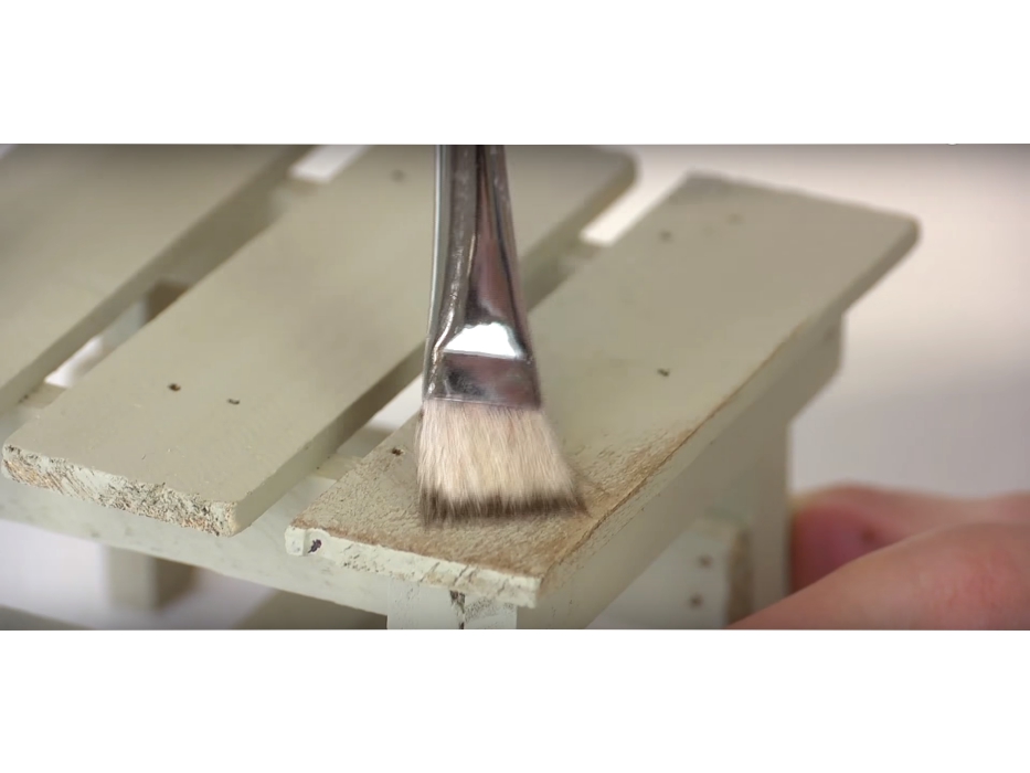 ミルクペイントで塗装した上から、かすれさせるように塗ることで経年による汚れを再現します。