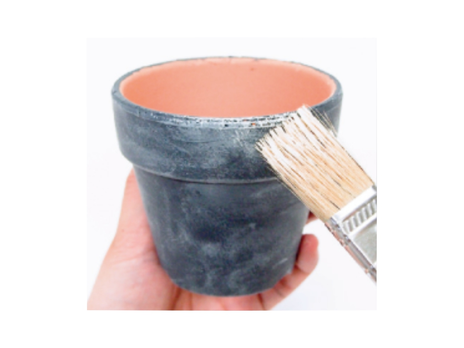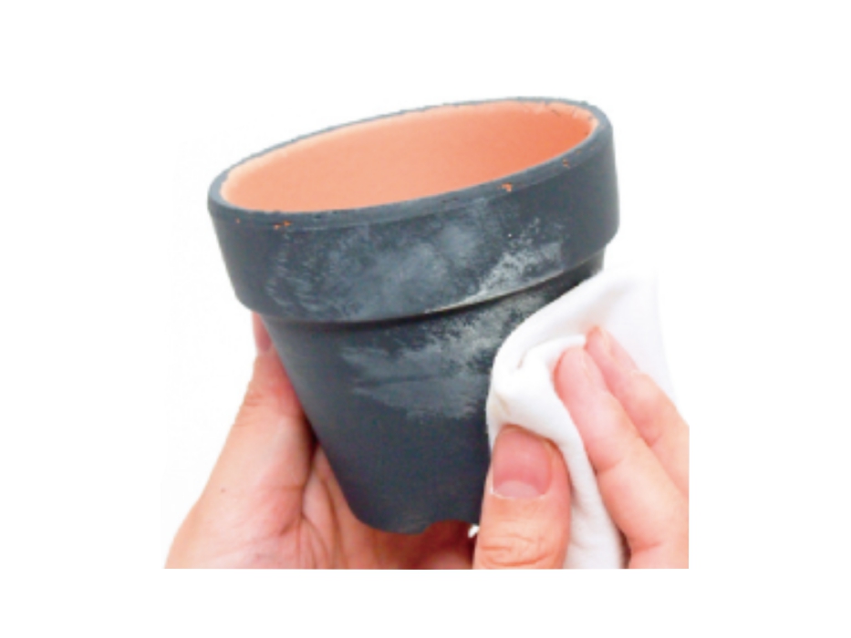 ミルクペイントで塗装した上から、かすれさせるように塗ります。経年による汚れや、ホコリをかぶった雰囲気を再現します。